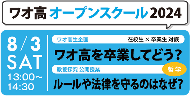 第四回は、1.ワオ高生企画 在校生 X 卒業生対談「ワオ高を卒業してどう?」2.教養探究の公開授業「ルールや法律を守るのはなぜ?」の2部構成で、ワオ高校をまるごと体験していただけます。