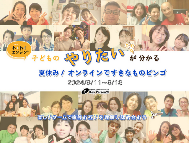 認定NPO法人キーパーソン21(神奈川県川崎市、代表:朝山あつこ)は8月11日(日)から8月18日(日)に、自宅からオンラインで参加できるキャリア教育プログラム『オンラインですきなものビンゴ』を開催します。キャリア教育の老舗NPOであるキーパーソン21が20年以上にわたり学校や地域の現場を中心に6万人以上の子どもたちに届けてきた「やりたいことを見つけるキャリア教育プログラム」を、オンラインを活用して、ご自宅から、親子で一緒に体験できます。