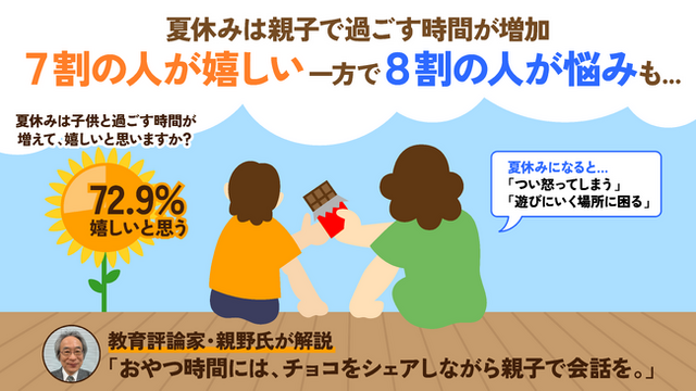 調査の結果、小学生の子どもを持つ親の3人に2人は、子どもの夏休み中は子どもと過ごす時間が増えることがわかり、増える人の中では4時間以上増加する人が最多でした。子どもとの時間が増えて嬉しい人が大半である一方、「つい怒ってしまう」「遊びに行く場所に困る」など夏休み特有の悩みを感じるという声も半数以上に上りました。普段の生活では「忙しくて子どもと過ごす時間がとれない」といった悩みを抱えている人が多いため、夏休みが子どもとゆっくり仲を深めるチャンスでもあると言える一方、どう過ごすかが鍵になりそうです。多くの方が意識的にとっている親子時間はおでかけや食事のシーンであることが調査で明らかになりましたが、教育評論家・親野先生曰く、その時間の過ごし方の質をあげていくことが親子関係に重要であるとのことです。