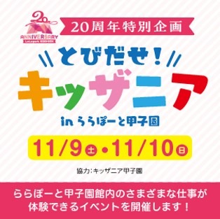 開業から20周年を迎える「ららぽーと甲子園」は、20年間支えていただいたお客さまへの感謝の気持ちと、これからの将来を担う子どもたちへ向けて、キッザニア甲子園の協力のもと「とびだせ!キッザニア in ららぽーと甲子園」を開催いたします。