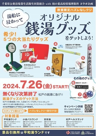 松戸市内の4つの公衆浴場(銭湯)で、千葉県立柏の葉高等学校情報理数科デザインチームが作成したオリジナル銭湯グッズがあたるスタンプラリーを開催します。