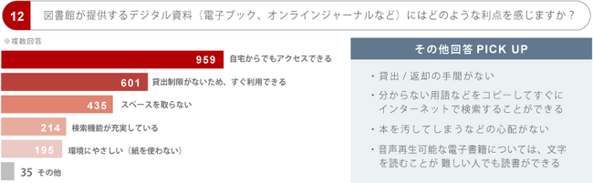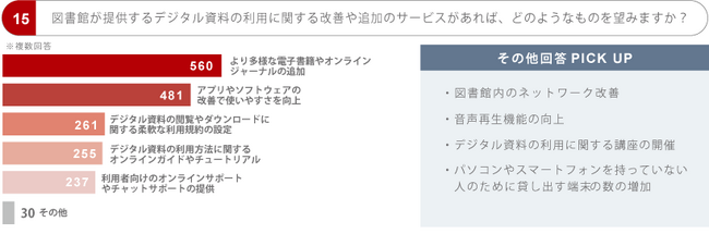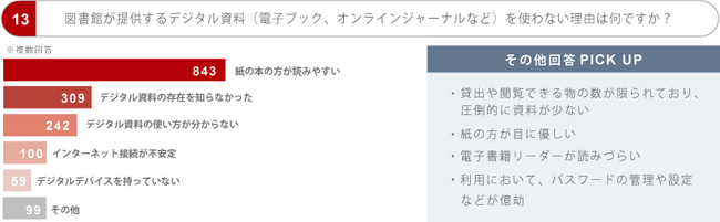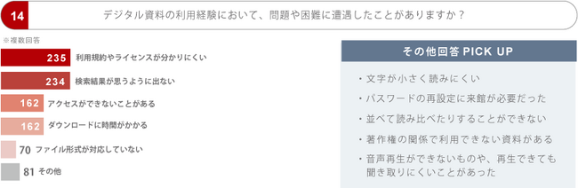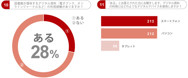 図書館が提供するデジタル資料(電子ブック、オンラインジャーナルなど)の利用経験がある人は、約4人に1人という結果になりました。デジタル資料は様々な機能がある反面、デジタル資料そのものや利用方法などに抵抗を感じる利用者も一定数存在することが分かりました。デジタル資料のサービス導入に伴い、各図書館では利用者が快適に利用できるためのサポートや機能の改善が必要である現状が見えてきました。