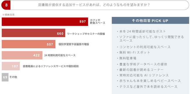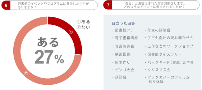 図書館のイベントやプログラムに参加したことがある人は、全体の27%。図書館では作家の講演会や図書館ツアー、子ども向けの読み聞かせ会など、本に親しむきっかけとなるイベントが開催されていることが分かりました。また、図書館に追加してほしいサービスとして、カフェや飲食スペース、ワークショップやセミナーの開催が望まれており、本を読む場所だけではない機能性のある図書館が求められています。