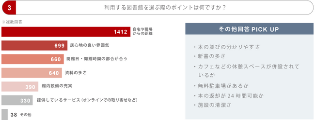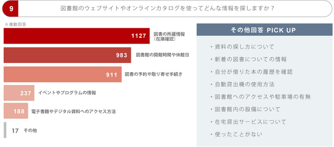 図書館利用についての質問を行いました。図書館を月に複数回以上利用するユーザーは全体の42%となり、家庭や日常生活のための情報収集を行っていることが分かりました。図書館を選ぶ際には、自宅や職場からの距離が近いことが重要視されており、無料で気軽に利用できる場所であることが分かります。ただし、施設の状況などによって、欲しい資料が借りられないなど、図書館を利用する際の障壁や課題もアンケートから見えてきました。