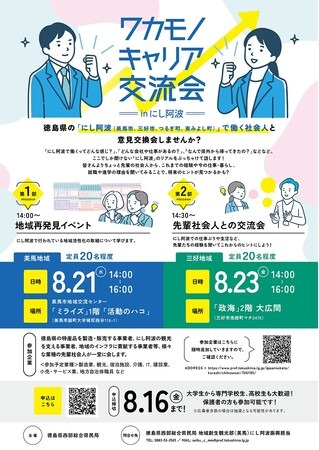 徳島県西部総合県民局では、これから就職や進学など将来のいろいろなことを決めていくワカモノ(大学生、高校生など)のみなさんに、地域を支える企業や、その中で輝いている社会人など、あまり知られていないけれど面白い「にし阿波」のリアルな姿を知っていただくため、今回の交流会を企画しました。