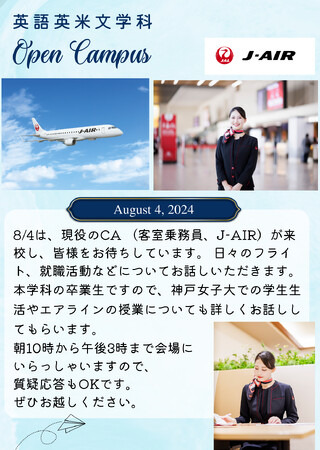 神戸女子大学 は、8月4日(日)に行われるオープンキャンパスに現役の客室乗務員である卒業生を講師に招き、これまでの経験談や学生当時のエピソードを交えて高校生と保護者に向けて講演を実施します。講師を務める卒業生は本学を2023年3月に卒業し、株式会社ジェイエアに就職。訓練期間を経て、現在では国内線を中心に業務を行っています。今回の目的は、航空業界についての正確な知識を高校生に提供し、業界の魅力や実態を理解させることです。更に、航空業界への進路選択に向けて、本学の英語英米文学科でキャリアを実現させるためのカリキュラムなど詳しい説明を提供する場でもあります。
