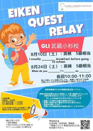 GLI武蔵小杉は今年度、新しい英語イベントプログラム「Eiken Quest Relay」を企画し、多くの方々からご好評を頂いております。ご要望にお応えし、今回、第5回目の追加開催が決定しました。