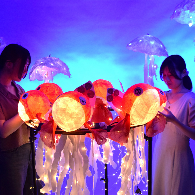玉川大学の学生による、ライトアップを午後3時から午後8時まで(予定)行います。夏の水辺に浮かぶ金魚やミズクラゲの光が集う、涼を呼ぶ夏の夜のひとときをお楽しみください。