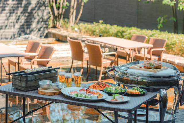 枝豆、だし巻き卵、シーザーサラダ、モッツァレラチーズとトマトのカプレーゼ、小エビの生春巻き、ポテトフライ、タンドリーチキン、本日のパスタ、特製ローストポーク(シェフによるカットサービス付き)、デザート(その場で焼いたお団子でつくる冷やしぜんざい)。