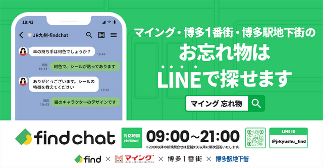 find導入により、お客さまは、博多ステーションビルが管理運営する「マイング」、「博多1番街」、「博多駅地下街」の3施設でのお忘れものをLINEから24時間お問い合わせいただけます。また、遺失物対応を行うスタッフ向けの業務アプリも導入することで、お忘れ物にかかわるスタッフの業務負担軽減を図るとともに、お客さまからのお問い合わせ等などにスムーズに対応できるようになり、より良いサービスを提供することができます。