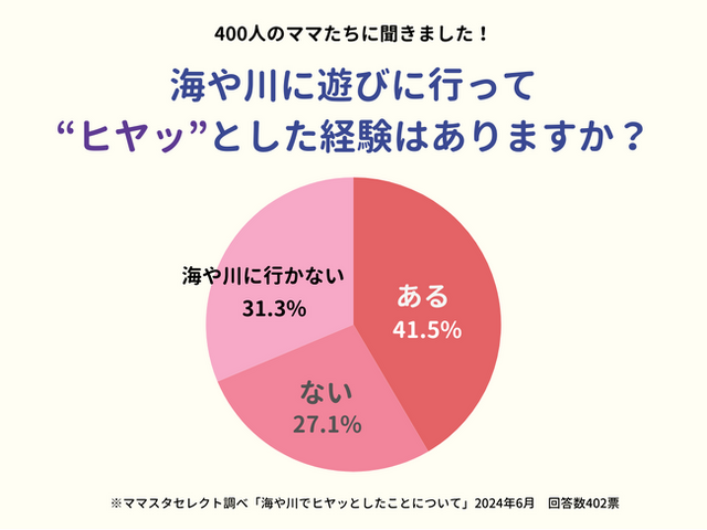 そこで今回ママスタセレクトでは「海や川に遊びに行ってヒヤッとした(危なかった・怖かった)」経験はありますか?」というアンケートを実施。選択肢には「ある」「ない」「海や川に行かない(遊ばない)」の3つを設定し、402人のママたちから回答を得ることができました。
