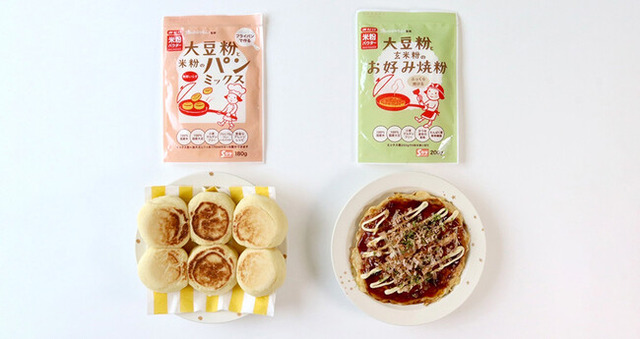 左:大豆粉と米粉のパンミックス、右:大豆粉と玄米粉のお好み焼粉