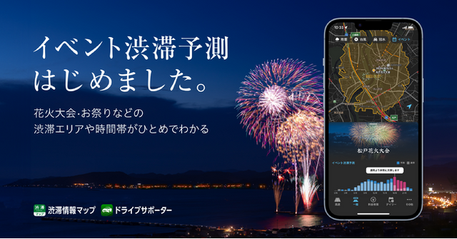 株式会社ナビタイムジャパン(代表取締役社長:大西 啓介、本社:東京都港区)は、2024年8月1日(木)より、リアルタイムの道路交通情報に特化したアプリ『渋滞情報マップ by NAVITIME』と、カーナビアプリ『NAVITIMEドライブサポーター』にて、花火大会とお祭りの会場周辺で、通常時よりも渋滞が予測されるエリアを地図上に表示する「イベント渋滞予測」機能を提供開始いたします。本機能は無料でお使いになれます。