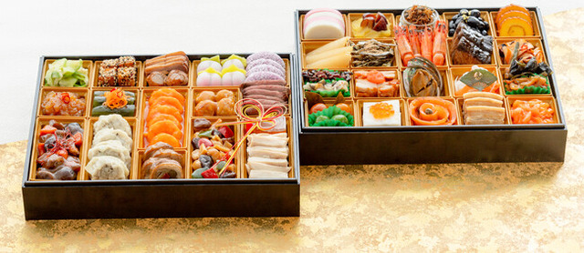若鶏明太焼、鮑福良煮、紅白なます 天・寿昆布、鰊昆布巻き、するめいか松前、金柑蜜煮、