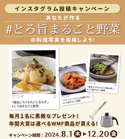 この度の投稿キャンペーンでは、まるごとたっぷりの野菜がとろける食感と旨みあふれる、“とろ旨まるごと野菜”レシピを作ることが出来る「フュージョンテック ミネラル」を使った料理を募集します。投稿キャンペーンにご応募いただいた方の中から、”毎月賞”として抽選で毎月1名様に「ボウルウィスク ミニ21cm」と「フュージョンテック ミネラルのレシピ本」をセットでプレゼントします。さらに、”年間大賞”では素敵な投稿をした方の中から1名様に選べる5万円相当のWMF商品を贈呈します。