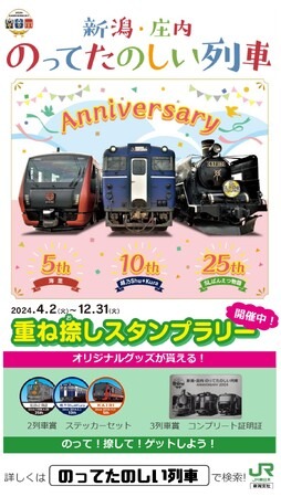 JR東日本新潟支社では、2024年に「海里」が運行開始から5周年、「越乃Shu*Kura」が10周年、「SLばんえつ物語」が25周年を迎えることを記念して、2024年12月31日(火)まで、「新潟・庄内 のってたのしい列車 重ね捺(お)しスタンプラリー」を開催中!