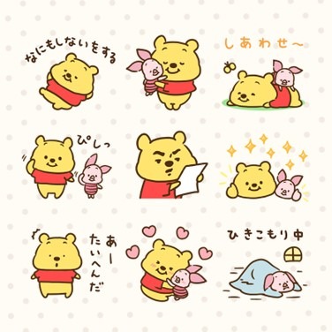 プーさんとピグレットののんびりと癒される日常を、人気イラストレーターの「もじじ」が描き下ろした、全40個のスタンプがセットになっています。どれも「くまのプーさん」のほのぼのとした雰囲気を楽しめる、日常生活で使いやすいデザインです。