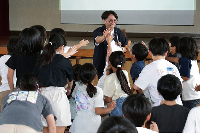 講演会場である体育館に集まった子どもたちは、佐藤さんが登場すると歓声とともにハイタッチで歓迎しました。