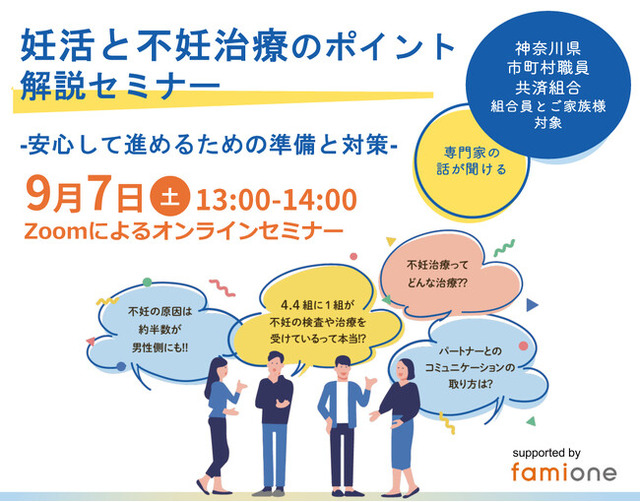 「子どもを願うすべての人によりそい 幸せな人生を歩める社会をつくる」をビジョンに掲げ、法人の従業員向け福利厚生や自治体の住民向け支援を行うヘルスケアサポートサービス「ファミワン」 https://famione.com/benefit/ などを展開する株式会社ファミワン(本社:東京都渋谷区、代表取締役:石川勇介)は、神奈川県市町村職員共済組合の組合員とその家族に向けて、オンラインセミナー「妊活と不妊治療のポイント解説セミナー -安心して進めるための準備と対策-」を9月7日に開催します。