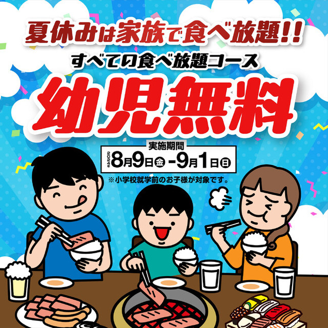 ◆内容:小学生就学前の幼児を対象に、すべての食べ放題コースを無料で提供いたします