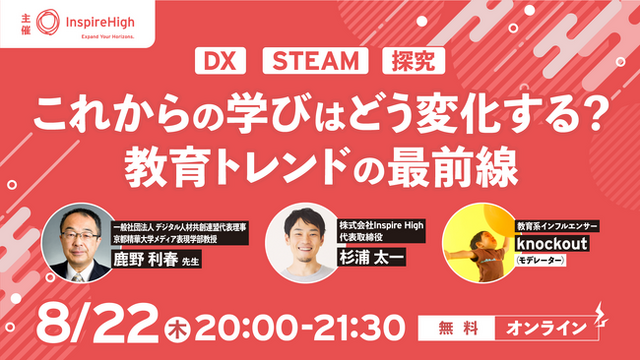 本セミナーでは、一般社団法人デジタル人材共創連盟代表理事・京都精華大学メディア表現学部教授の鹿野利春先生、株式会社Inspire High代表取締役の杉浦太一、そしてモデレーターに教育系インフルエンサーのknockoutさまをお迎えし、気になる教育の最新情報をパネルディスカッション形式で深堀りします。