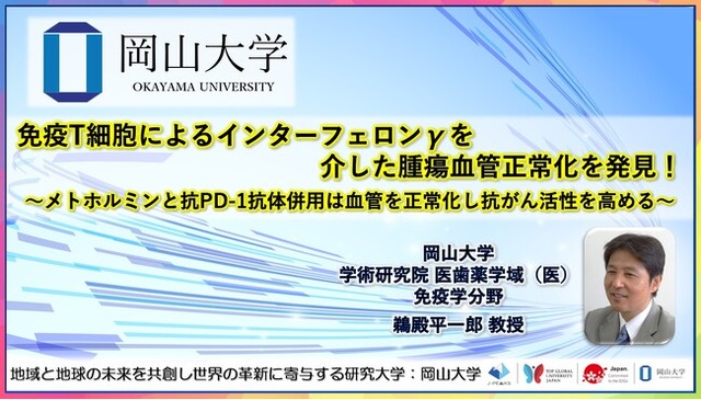 国立大学法人岡山大学(本部:岡山市北区、学長:那須保友)の学術研究院医歯薬学域(医)免疫学の鵜殿平一郎教授、徳増美穂助教、西田充香子助教を中心とする金沢大学の内藤尚道教授、北海道大学の樋田京子教授のメンバーからなる研究チームは、糖尿病治療薬メトホルミンと 抗PD-1抗体の併用療法は腫瘍浸潤CD8T細胞(CD8TILs)を強力に活性化してインターフェロンγ(IFNγ)を産生し、IFNγが異常な腫瘍血管を正常化してCD8T細胞のさらなる腫瘍内流入を促進することを明らかにしました。