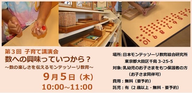 この講演会では、モンテッソーリ教育の教師といっしょに、幼児の数に対する興味のめばえやその育み方を学ぶとともに、算数の楽しさを感じていただきます。