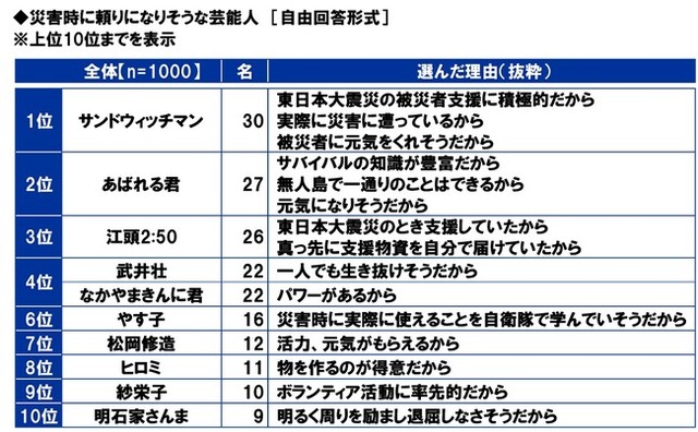 選んだ理由をみると、1位の「サンドウィッチマン」では「東日本大震災の被災者支援に積極的だから」「実際に災害に遭っているから」「被災者に元気をくれそうだから」、2位の「あばれる君」では「サバイバルの知識が豊富だから」「無人島で一通りのことはできるから」「元気になりそうだから」、3位の「江頭2:50」では「東日本大震災のとき支援していたから」「真っ先に支援物資を自分で届けていたから」といった回答がみられました。