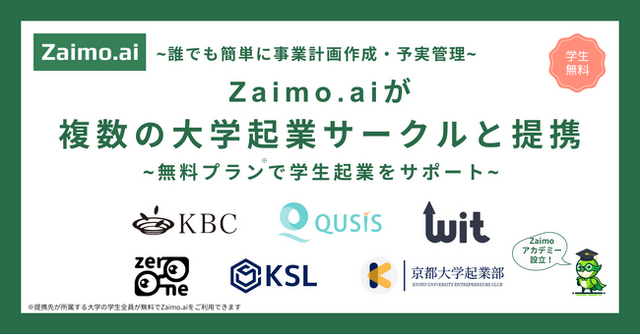「経営を自由で創造的に。」をミッションに掲げ、誰でも簡単にExcel事業計画の作成や経営管理ができるAI経営管理SaaS「Zaimo․ai」を提供するZaimo株式会社(代表:古城巧、所在地:東京都渋谷区)は、国内の大学に属する複数の起業団体と提携いたしました。この提携の一環として、提携起業団体が属する大学の学生の方々はZaimo․aiを無料でご利用いただけます!また無料プランをご利用の学生ユーザーは「Zaimoアカデミー」というワークスペースに所属し、起業意識の高い学生とつながることができます。