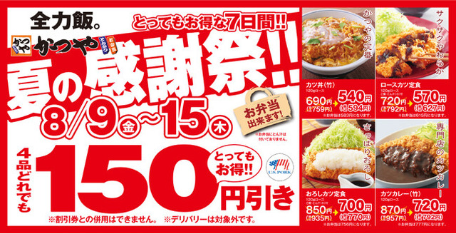 アークランドサービスホールディングス株式会社の子会社、とんかつ専門店「かつや」を展開している株式会社かつや(本社:東京都千代田区/代表:大内 勇一)は、国内「かつや」にて、人気の4品がどれでも150円引きでお得な「夏の感謝祭」を2024年8月9日(金)~15日(木)の7日間限定で開催いたします。