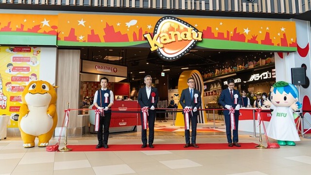 カンドゥー新利府グランドオープン初日に、利府町長 熊谷 大さま、イオンモール株式会社 CX創造本部 東日本支社東北・北海道事業部長 佐藤俊夫さま、イオンモール キッズドリーム合同会社 代表職務執行者 末松 央行さま、株式会社マーキュリー/カンドゥー新利府店長 内藤拓也が登壇したオープニングセレモニーを実施しました。また、カンドゥーの公式キャラクターイゴーと、利府町観光協会キャラクター十符の里の妖精リーフちゃんもかけつけてくれました。