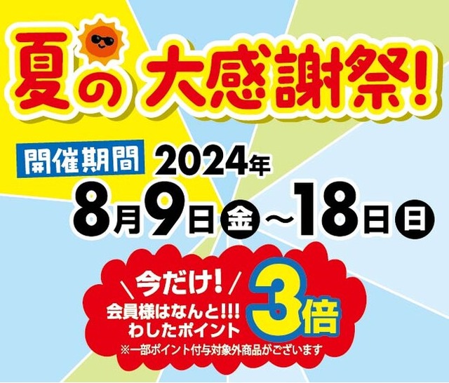 全国のわしたショップ10店舗およびわしたショップオンラインでは、日頃わしたショップをご愛顧いただいている会員様に感謝の気持ちを込めて、8月9日(金)~8月18日(日)の10日間、会員様は期間中、わしたショップでのお買物で貯まるわしたショップポイントが3倍になる夏の大感謝祭を開催いたします。(期間中新たに会員様になられた方もポイント3倍対象)