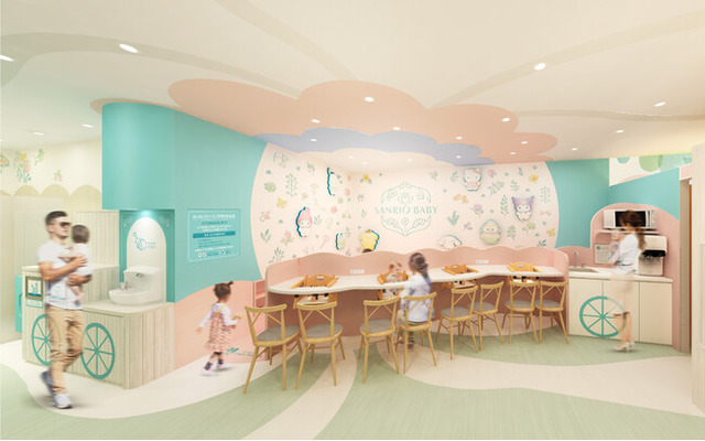 今回リニューアルするベビーセンターのテーマは「おやこの笑顔が咲くギフトタイム」。”大切なあなたの笑顔が咲きますように。”をコンセプトとしたギフトブランドとして展開している「Sanrio Baby」のデザインを取り入れ、壁にはサンリオのキャラクターたちの姿が描かれています。パステルカラーを基調としたあたたかな空間で、お子様はもちろん、家族をはじめ利用するみなさまに笑顔になってもらえるような空間を提供していきます。