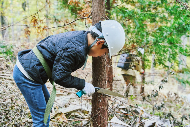 今回はグループにわかれて育樹体験。森のプロに教えてもらいながら、枝打ち・間伐をします。