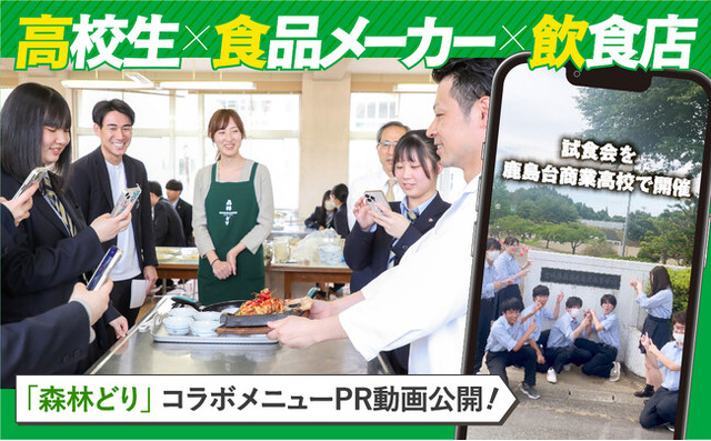 ウェルファムフーズでは、2022年9月より、宮城県鹿島台商業高等学校のマーケティング授業の一環として、「森林どり」のマーケティング課題を分析し、解決策を発表する共同授業を実施していました。その中でも、2023年10月に「森林どり」公式YouTubeチャンネル、及び公式Instagramで公開した同校生徒考案のPR動画「地元の高校生が宮城県産森林どりを食べてみた!」が、取り組み内容と併せて、業界内外から評価を受けました。これがきっかけとなり、今回のコラボレーションメニューにおける出張授業が実現いたしました。