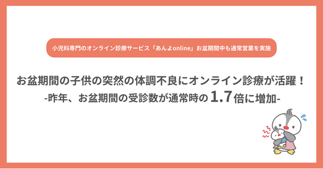小児科専門のオンライン診療サービス「あんよonline」においては大型連休のタイミングで「救急外来を受診すべきか医師の意見を聞きたい」や「いつものお薬が切れてしまったから処方してほしい」などの理由から受診される人が増える傾向にあります。昨年のお盆では受診数が通常の1.7倍にも増えました。