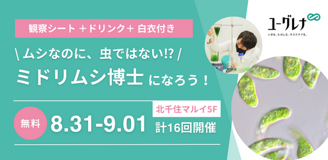 株式会社ユーグレナ(本社:東京都港区、代表取締役社長:出雲充、以下「ユーグレナ社」)は、株式会社丸井グループ(以下「丸井グループ」)が展開する北千住マルイにて、微細藻類ユーグレナ(和名:ミドリムシ、以下「ユーグレナ」)を観察することを通して、生物の奥深さやおもしろさを体験するワークショップを、2024年8月31日(土)と9月1日(日)に開催します。
