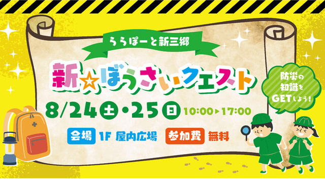 三井不動産商業マネジメント株式会社(所在:東京都中央区 代表取締役社長 大林修)が運営する三井ショッピングパークららぽーと新三郷にて、株式会社EnPalが実施する防災の知識が学べる『ららぽーと新三郷 新・防災クエスト』を2024年8月24日(土)・8月25日(日)の2日間で開催します。
