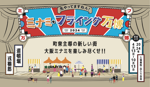 「先やってますねん!ミナミ・フライング万博2024」は、EXPO2025大阪・関西万博の開幕1年前の2024年4月13日(土)から10月13日(日)までの期間、道頓堀・戎橋筋・なんば広場を中心とする大阪ミナミの公共空間を活用し、町衆主導のさまざまなイベントで街全体を盛り上げていくプロジェクトです。この立ち上げに伴い、大阪ミナミに位置する2つの商店街「道頓堀商店会」「戎橋筋商店街振興組合」および「なんば広場」の公共空間に隣接する団体がタッグを組み、「NDK連絡会」を発足。万博をフライングして街なかで“おもろいこと”を展開していきます