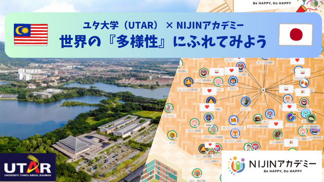 ユタ大学(UTAR)からは日本に興味をもつ大学生が10名参加し、マレーシアのリアルな生活や大学生活を動画で紹介し、約20名のNIJINアカデミーの小・中学生と交流した。NIJINアカデミーの生徒らは、日本の地域の魅力やアニメなどサブカルチャーを紹介し、日本語と英語が飛び交う中での交流を楽しんだ。