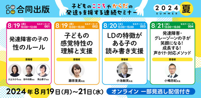 合同出版 子どものこころやからだの発達を支援する 連続セミナー2024夏 新学期に向けて子どもが輝く支援を伝授! 特別支援教育・療育・保育の現場で、すぐ役立つ知識や支援のポイントを、最前線で活躍する講師陣がお届けします。みなさまの参加をお待ちしております。