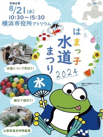 8月21日(水)横浜市役所アトリウムにて、横浜の水道について大人も子どもも楽しみながら学べるイベント「はまっ子水道まつり2024」を開催します。当日は、ろ過実験や丸太切り体験、縁日、キャラクターグリーティングなどをお楽しみいただけます。ぜひお越しください!