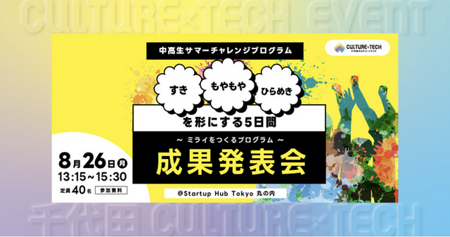 今回の登壇は、千代田CULTURE x TECHの取り組みへの共感と、リバティーンズ株式会社の「AIを活用する未来のために子どもたちに伝えていきたいこと」という思いが一体となり実現しています。5日間のプログラムを終えた子どもたちのアイデアを聞きたい方のお申し込みをお待ちしております。