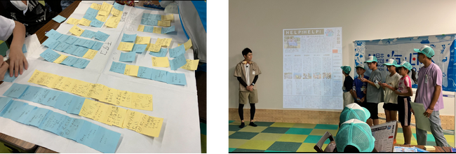 2日間の学びを共有するため号外制作を実施。学んだことをポストイットで書きだし、何がポイントだったのかを班のみんなで振り返ったのちに、「水質調査」「干しダコ」「漁協セリ」「磯浜調査」「かいぼり」のテーマで分担して記事を作成。200字という限られた文字数の中で、大事なポイントをしっかりとまとめました。その後、初日の夕食でも食べた西海醤油さんの「たこカレー」のパッケージに載せるオリジナルラベル(4コマ漫画)の制作に挑戦。各班ごとにテーマを決め、起承転結の形になるよう、一生懸命考えました。号外の内容や4コマ漫画についての発表も行い、他者へ説明することで一層理解が深まりました。