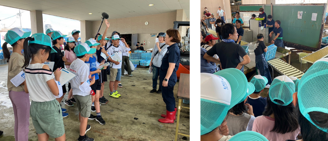 講師の寺田 真理先生(明石浦漁業協同組合 )に案内していただき、実際にセリを見学。また、セリにかかるものとかからないものがあること、セリでは普段使わない言葉で取り引きが行われていることなどを学びました。囲み取材では「売れなかった魚はどうするの?」といったの素朴な疑問を問いかけました。海のバンキシャメンバーは、記者手帳(学習ノート)にびっしりとメモを取りながら、真剣な表情で話を聞いていました。
