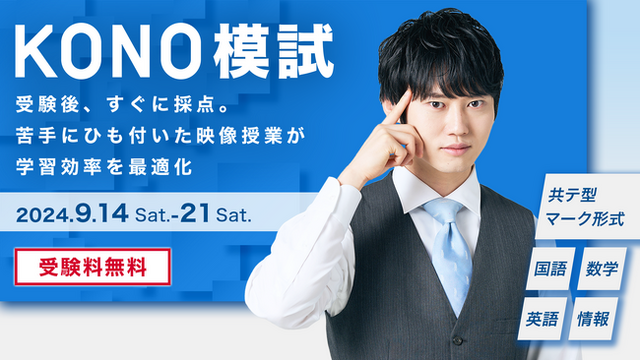 人生において、入試は大きな分岐点ですが、模試は入試合格に欠かせません。入試本番であなたを支えてくれるのは、沢山の模試で積み重ねた確かな自信です。KONO模試は、あなたが積み重ねる自信の一つになりたい。住む場所や家庭環境に関わらず、合格を望む全ての学生に取り組んでもらえるよう、オンラインで無料での実施に至りました。