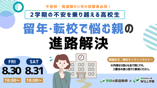 株式会社 学研ホールディングス(東京・品川/代表取締役社長:宮原博昭)のグループ会社、株式会社 学研エル・スタッフィング(東京・高田馬場/代表取締役社長:伊藤弘雅)は、展開する「学研のWILL学園」で夏休み~夏休み明けに一気にご相談が増える「高校生の留年・転校」について正しく理解いただくため、2024年8月30日(金)と8月31日(土)に「2学期の不安を乗り越える高校生~留年・転校で悩む保護者向け進路解決」無料オンラインセミナーを開催します。