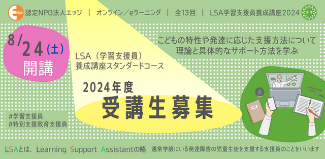 NPO法人エッジの【LSA(学習支援員)養成講座 】は、2005年から行政(東京都港区)と協同で始まりました。18年間で2000人以上が受講。特性や発達に応じた支援ができる人材として、子どもたちをサポートしてきました。
