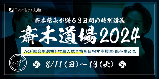 Loohcs株式会社(代表取締役:嶺井 祐輝、本社所在地:東京都渋谷区桜丘町)は、同社運営の総合型選抜・AO推薦入試専門の学習塾「Loohcs志塾」において、2024年8月11日から13日まで「斎木道場2024夏」を開催いたしました。
