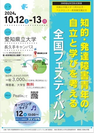 知的・発達障害青年の自立と学びを考える全国フェスティバルは洲崎福祉財団の助成を受け、2024年10月12日~13日愛知県立大学長久手キャンパスにて開催します。このイベントは、障害のある青年たちが高校・高等部卒業後も学び続けられる“大学”教育の創造や働くだけでなく、社会参加や自己表現を目指す豊かな人生のあり方について、障害青年、家族、教員、支援者、研究者などさまざまな立場の方が参加し、ともに学び、そして発信していくイベントとなります。このイベントを通じて、新たなコミュニティの形成と交流の促進を目指しています。